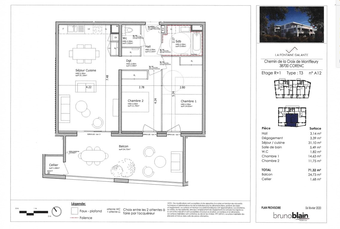 CORENC - 190 Avenue de l'Eygala - au sein d'une copropriété de standing 'La Fontaine Galante'. Venez découvrir cet agréable T3 de 71.32 m2 situé au 1er étage sur 2 avec ascenseur, comprenant une entrée avec placard aménagé, une cuisine aménagée et équipée d'une plaque de cuisson, four et d'une hotte ouverte sur séjour de 31.10m2 donnant sur une belle terrasse dallée de 24.73m2, deux chambres de 14.63m2 et 11.75 m2 avec placards aménagés. Une salle de bains avec meuble vasque et un WC séparé. Un DOUBLE garage avec porte automatique compris dans la location au sous-sol. Copropriété livrée en 2022. Environnement calme, Tennis de Corenc à proximité. A quelques minutes seulement du centre-ville, vous trouverez de nombreuses commodités : école maternelle et primaire accessible, commerces de proximité, accès rapide aux transports en communs. Loyer 1003 € + 101€ de provision pour charges avec régularisation annuelle. Chauffage et eau chaude individuel au gaz - eau froide individuelle. Honoraires de location 730.70€ + 219.21€ de frais d'état des lieux. Dépôt de garantie : 1003 €. Disponible à partir du 07/02/2026. Ce bien est soumis aux statuts de la loi PINEL (revenus plafonnés). Photos à venir