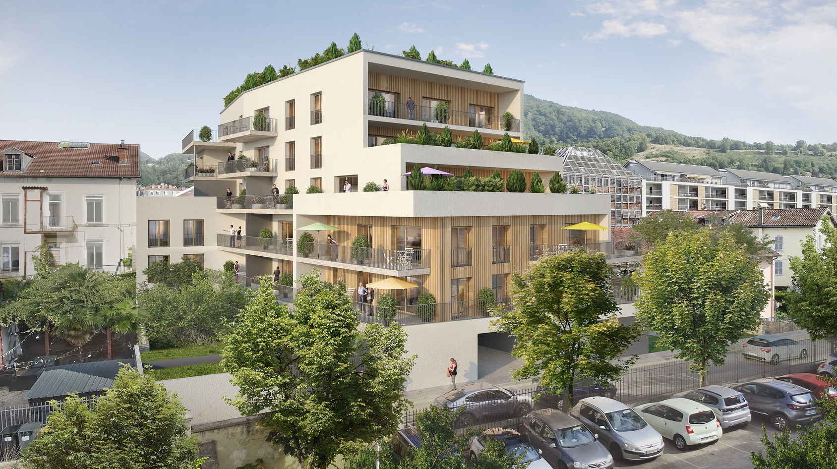Espaces extérieurs soignés avec terrasses végétalisées et bardages bois à claire-voie.