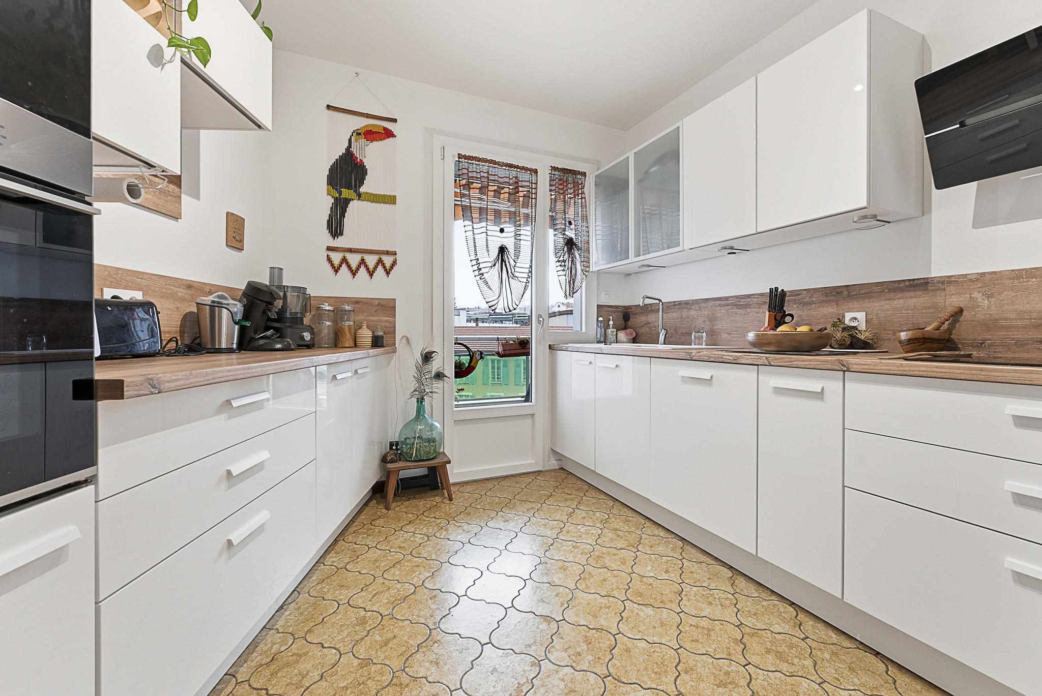 L'appartement est traversant Est/Ouest avec un grand blacon filant sur le salon avec ses grandes baies vitrées et une petite terrasse donnant sur une belle cuisine entièrement équipée. Un couloir avec rangement dessert trois belles chambres et une salle d'eau.